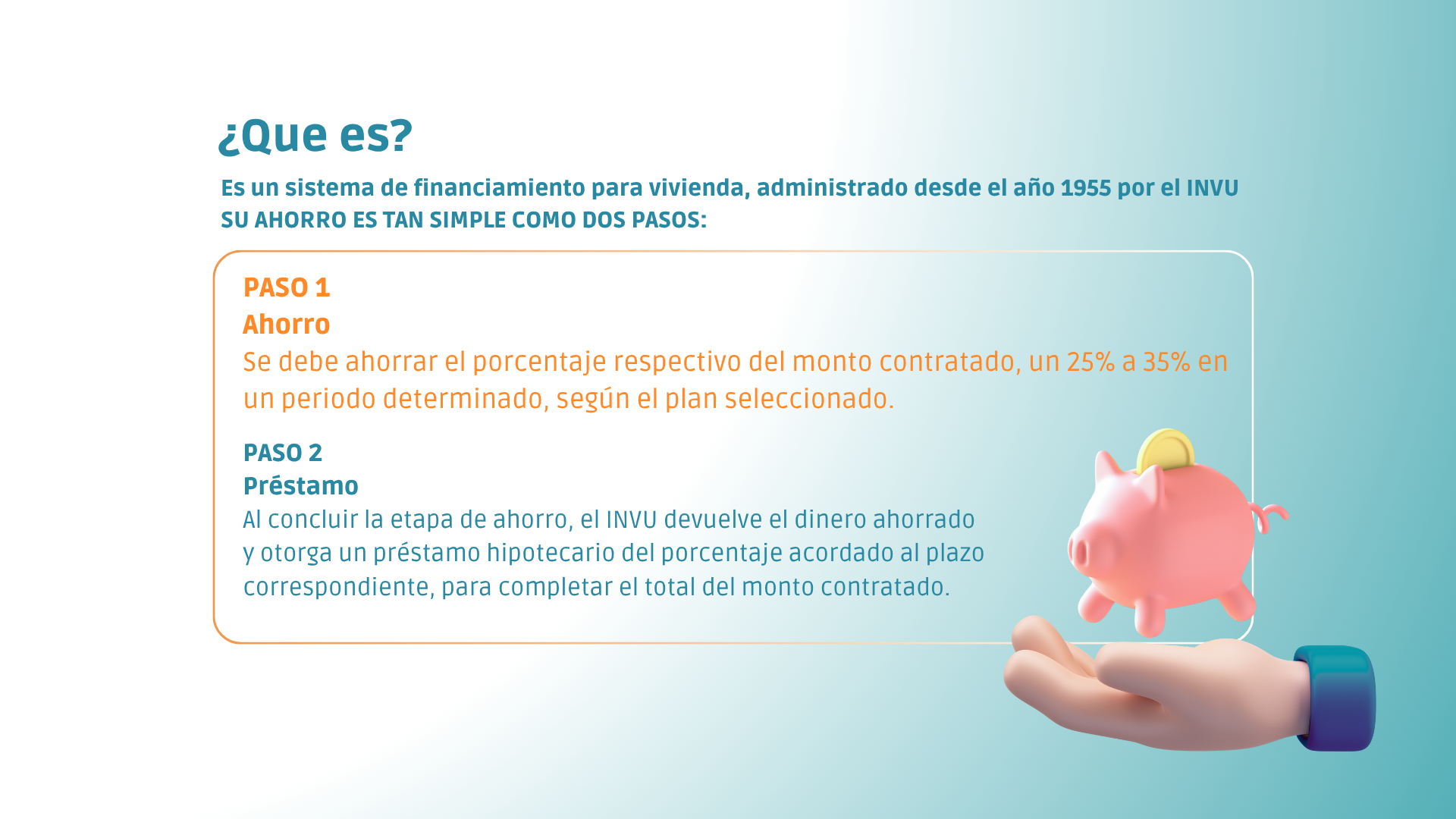 Los planes de ahorro y prestamo del INVU son un sistema de financiamiento para vivienda, administrado desde el año 1955 por el INVU. Su ahorro es tan simple como dos pasos: